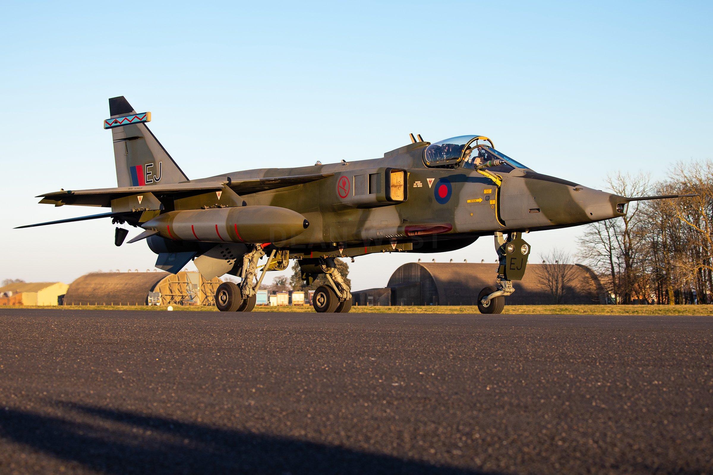 The spring conditions were perfect for the taxi run. The timing of the taxi runs during late afternoon ensured that the Jaguar could be photographed against a backdrop of trees and HASs, as opposed to a backdrop of cluttered Bentwaters Parks industrial units which sit to the north of the runway. This was just perfect in the fading spring light. Photographers were positioned alongside the runway, just 20 metres from the centreline, for the most exhilarating, adrenaline-inducing experience you could ask for. After a short slow taxi to position the Jaguar at the end of the runway, the aircraft powered down the Bentwaters runway with the Adours well illuminated in the fading light. Epic.