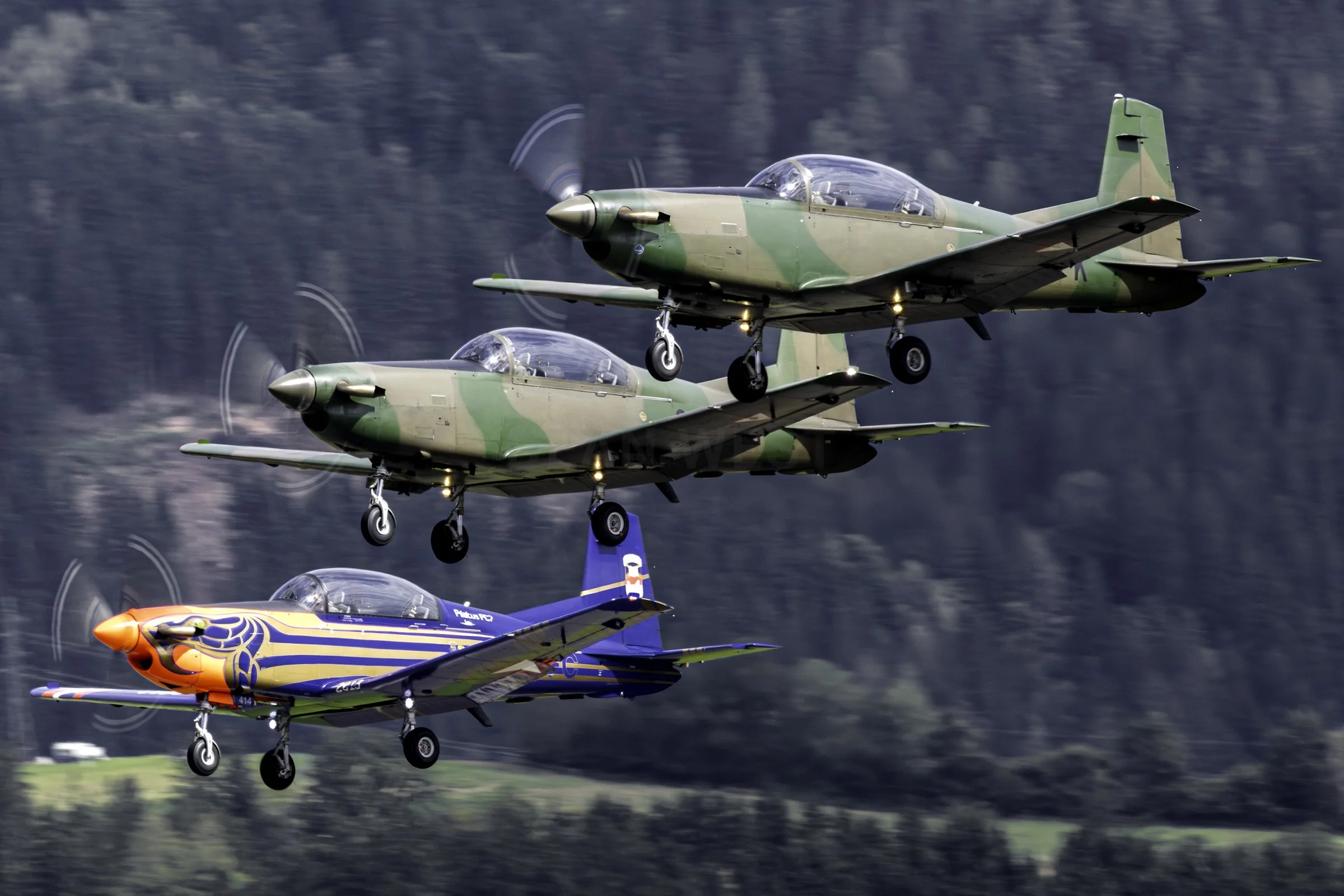 Military participants from 12 nations contributed to an eight‑and‑a‑half‑hour flying display, including a strong Austrian Air Force presence, with at least one of every type in their inventory taking to the air. The EF2000 pair proved a crowd favourite, opening with a mock intercept of an Austrian C‑130K Hercules before transitioning into a dynamic routine of air combat manoeuvres, complete with synchro elements woven throughout. Further Austrian fixed‑wing representation came from the DA‑40s and PC‑7s, flying a 3‑ship and 4‑ship respectively, in a series of relaxed combined flypasts, before a single PC‑7 broke away for a solo routine.